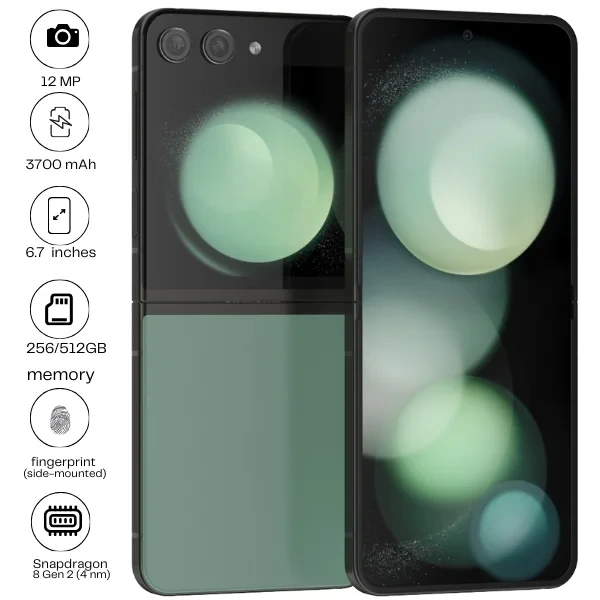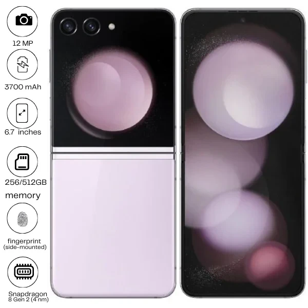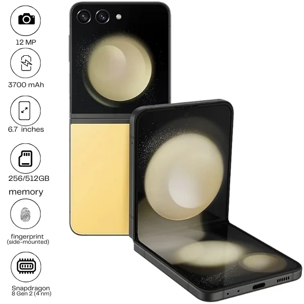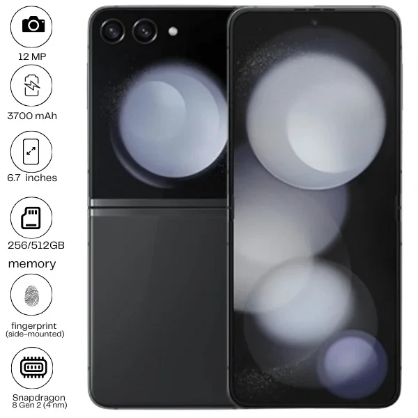 The Samsung Galaxy Z Flip5 features a 6.7" foldable AMOLED display with a resolution of 1080x2640 pixels. It boasts a 12MP dual-camera setup capable of 4K video recording at 2160p. Powered by a 3700mAh battery, it supports 25W fast charging and 15W wireless charging. Stylish and compact, it's perfect for modern multitasking.